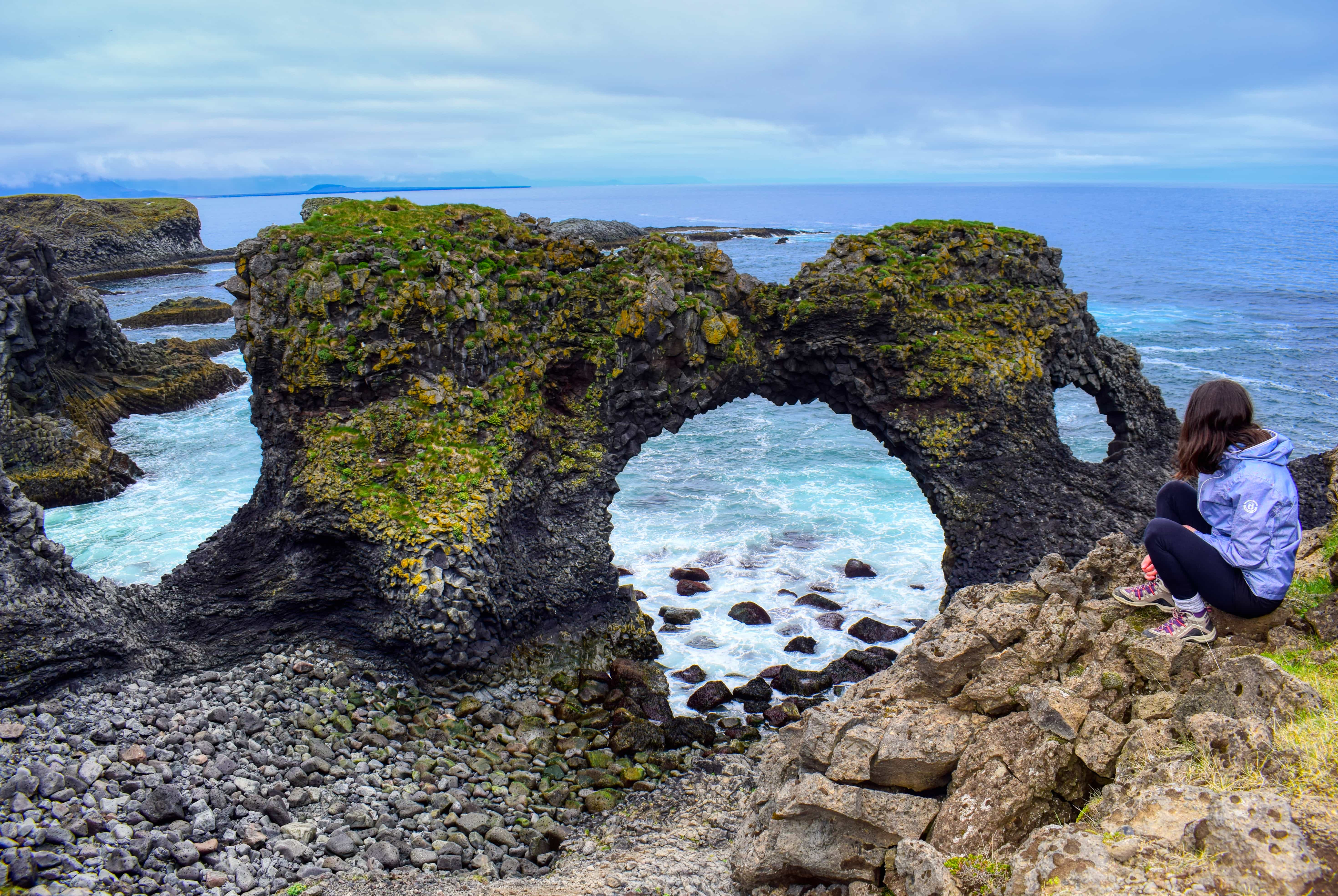 Mai apoi ne vom bucura de una dintre cele mai spectaculoase și dramatice zone de coastă din Islanda: Arnarstapi (aceasta fiind rezultatul combinației dintre vulcanismul anterior al zonei și acțiunea valurilor care spulberă în timp roca vulcanică fragilă). Podul de piatră, Gatklettur (Arcul de piatră), Muntele Stapafell, numeroase formațiuni de bazalt incredibile, statuia lui Bardur Snaefellsas - sunt doar câteva dintre obiectivele de aici care vă vor cuceri necondiționat sufletul și privirea. Aici avem la dispoziție și o oră pentru prânz.