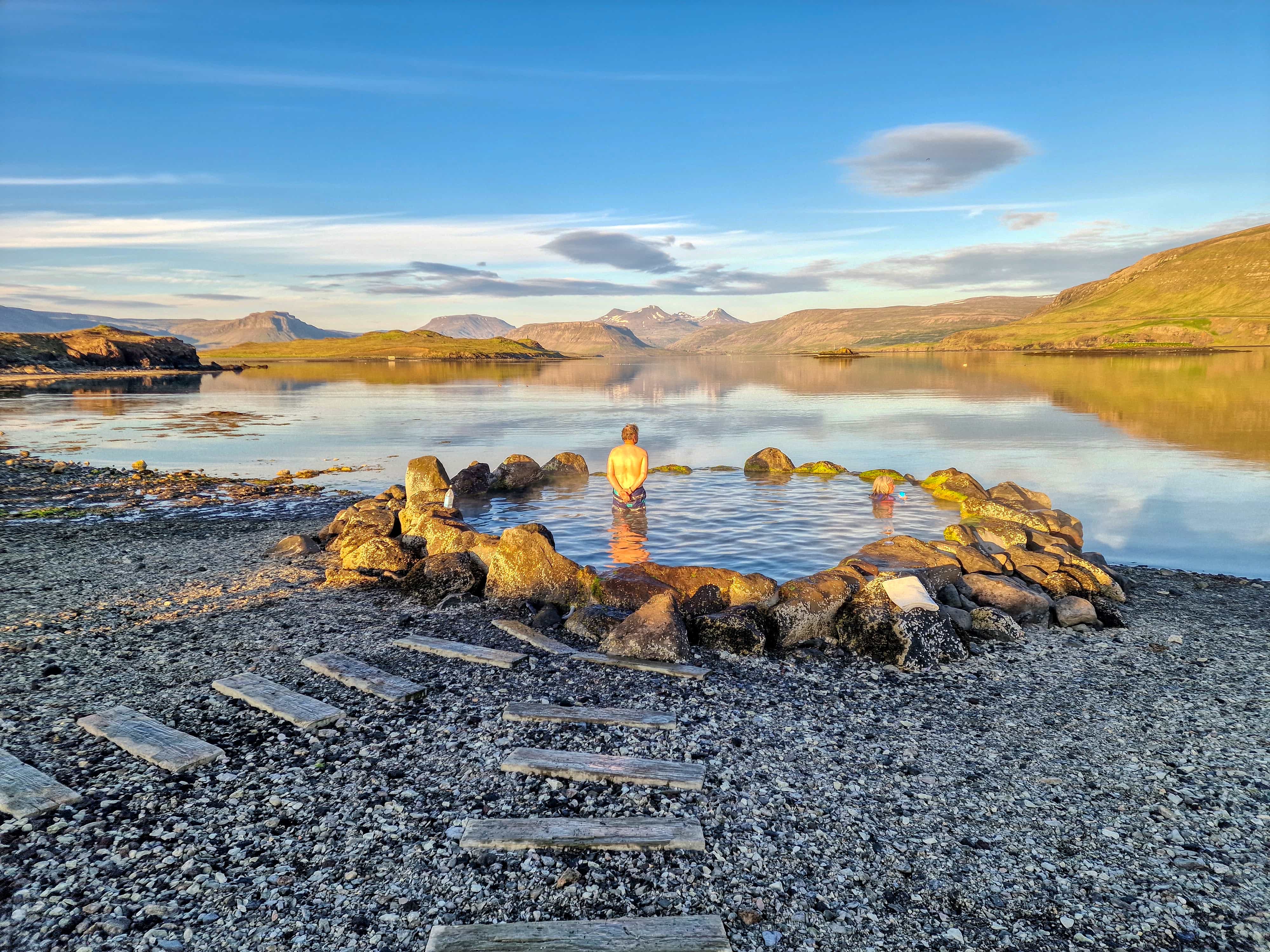 Sosim la Gudrunarlaug, un hotpot idilic cu o vechime de peste 1000 de ani, reconstruit și redeschis publicului abia în anul 2009 - și asta după ce a petrecut mai bine de 140 de ani blocat de o alunecare de teren. Dacă hotpot-ul va fi plin/aglomerat, vom avea posibilitatea de a ne relaxa la Saelingsdalslaug, piscina locală situată la aproximativ 200 m distanță de Gudrunarlaug.